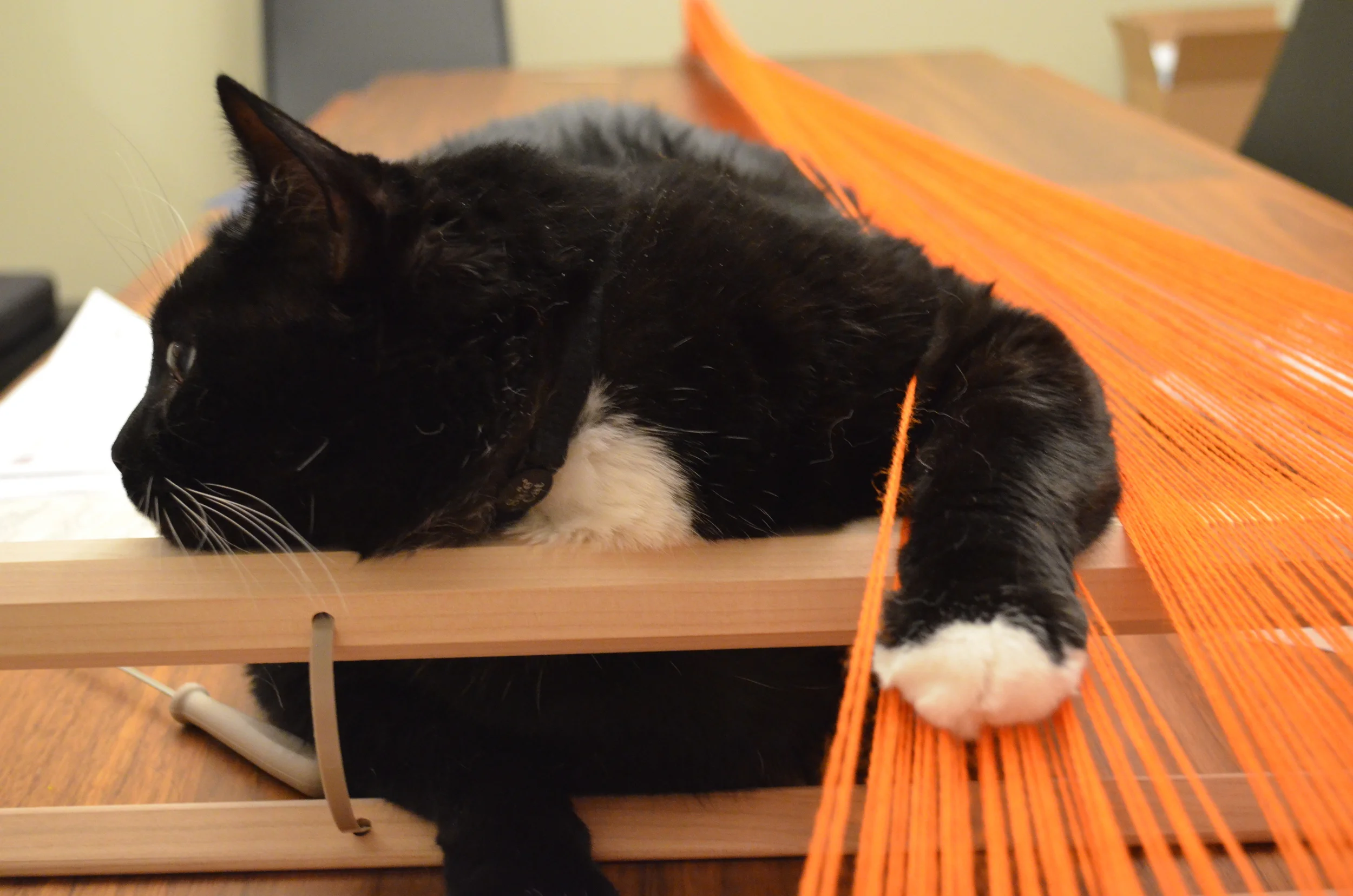 Good thing I have a helper (well, he thinks he's helping) because warping is hard work and it's been a busy day. I had a bright and early visit to the dentist, which is not my favorite place even when I get the all good at the end of the visit like I did today.
